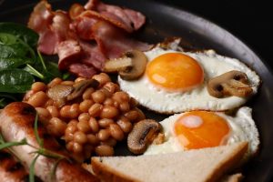 Склад : курячі яйця, сосиски на грилю (індичі ) бекон ,квасоля у томатному соусі ,печериці, шпинат, хліб пшеничнийСніданкиАнгліський сніданок з тостом