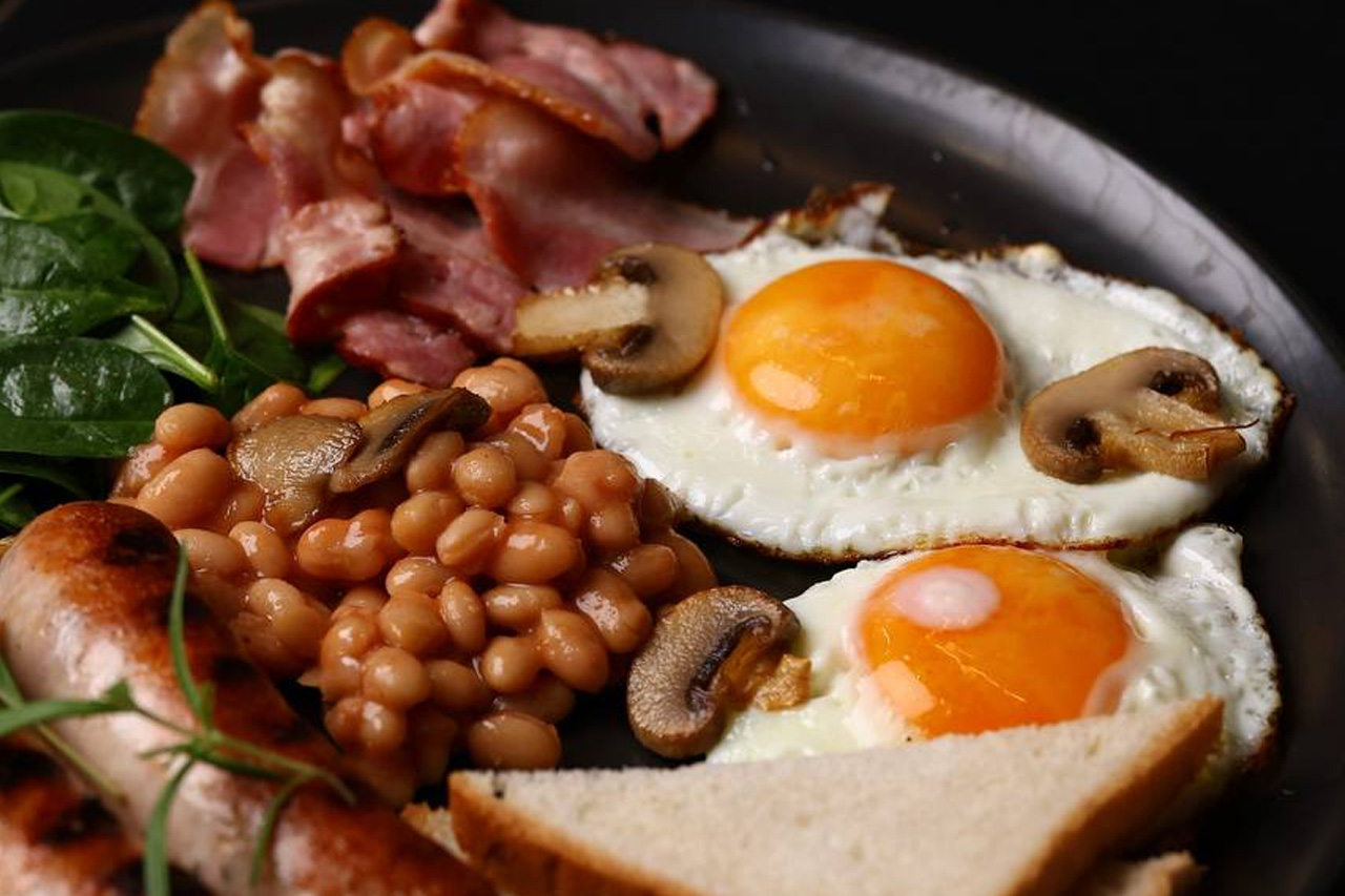 Склад : курячі яйця, сосиски на грилю (індичі ) бекон ,квасоля у томатному соусі ,печериці, шпинат, хліб пшеничний
