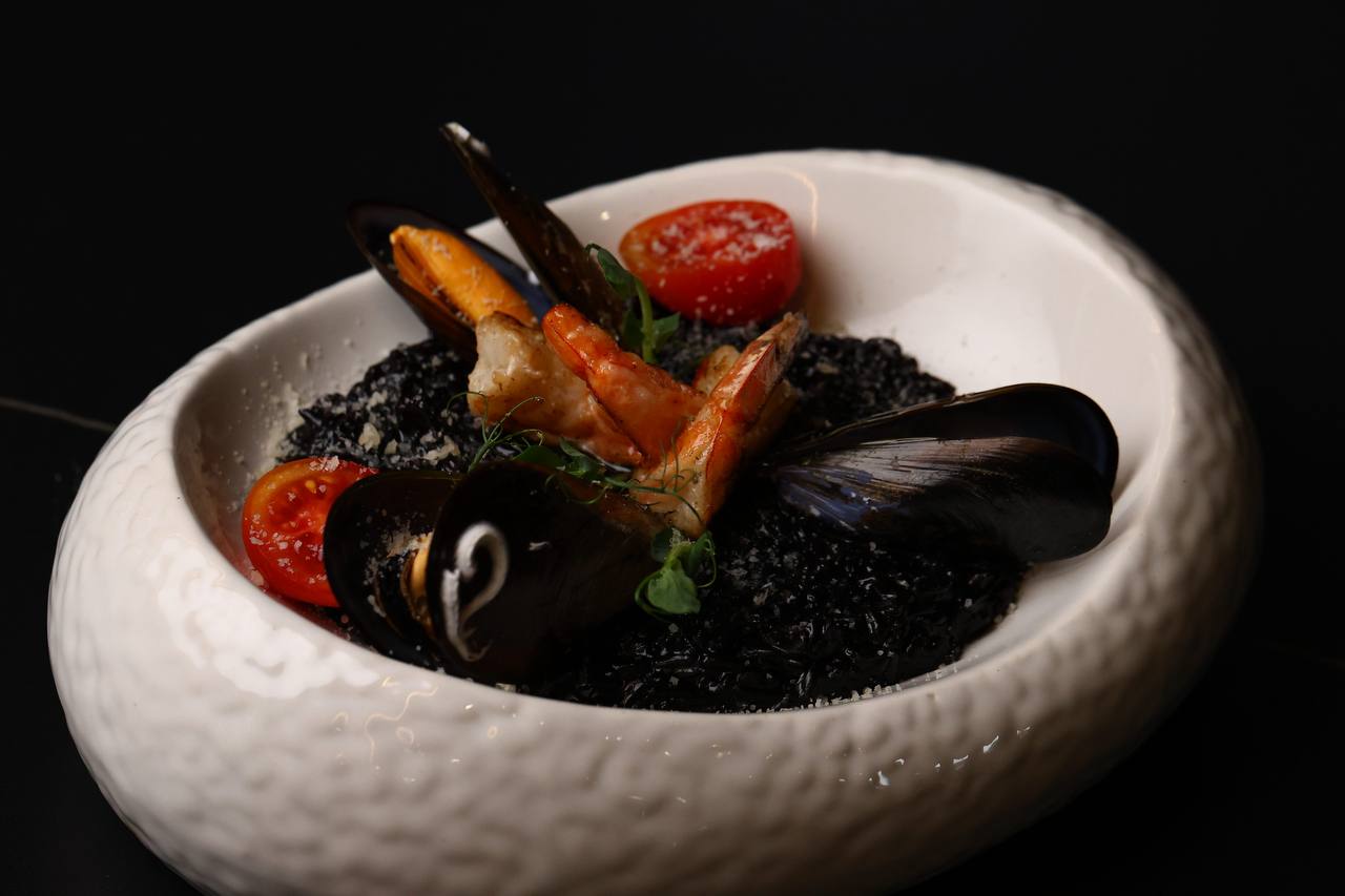 Склад: дикий рис, чорнило каракатиці, пармезан, соус дор-блю, креветка, мідія в мушлі