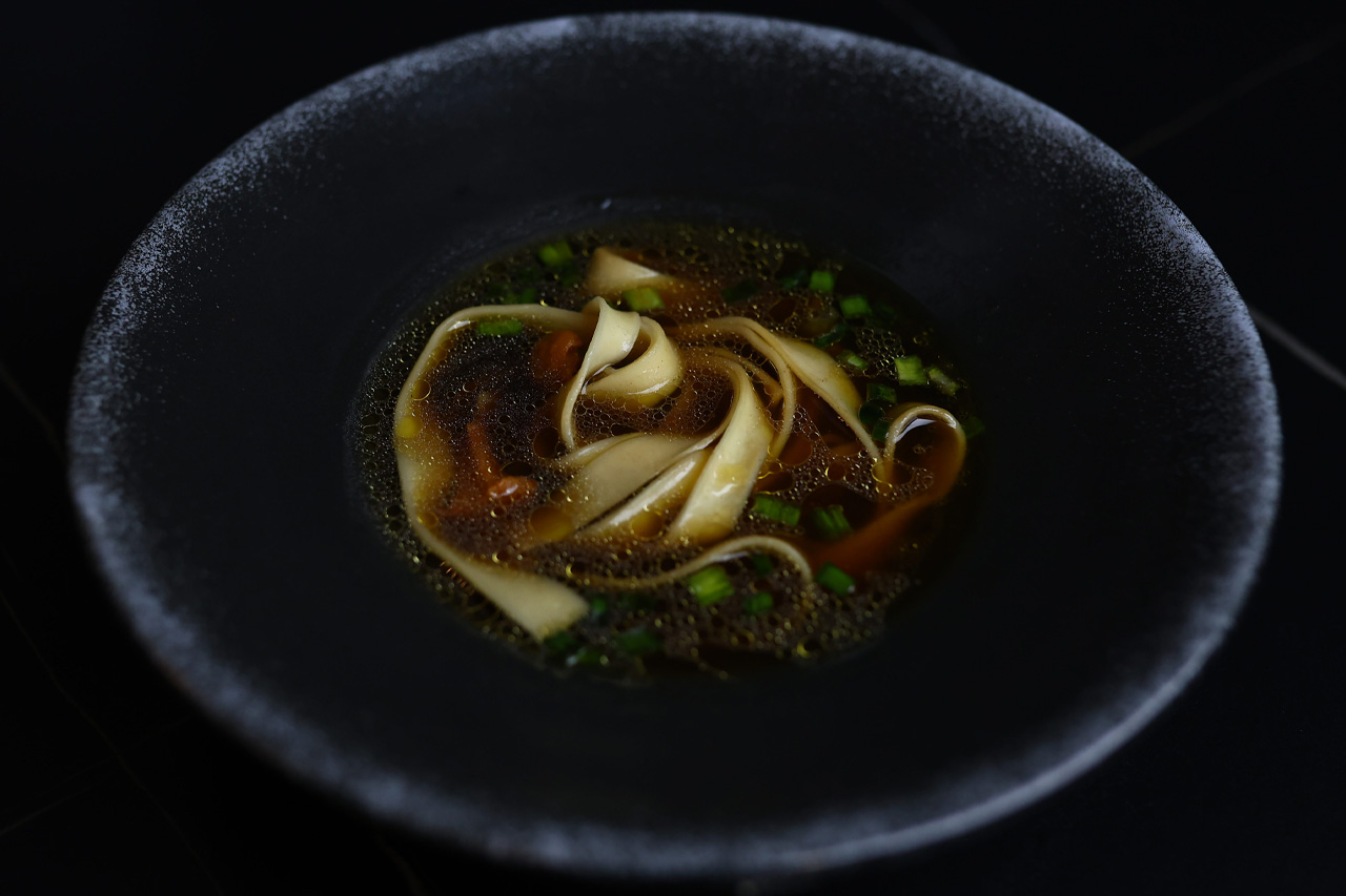 Крем суп з лисичок та сиру чеддер з грінками та зеленою олією