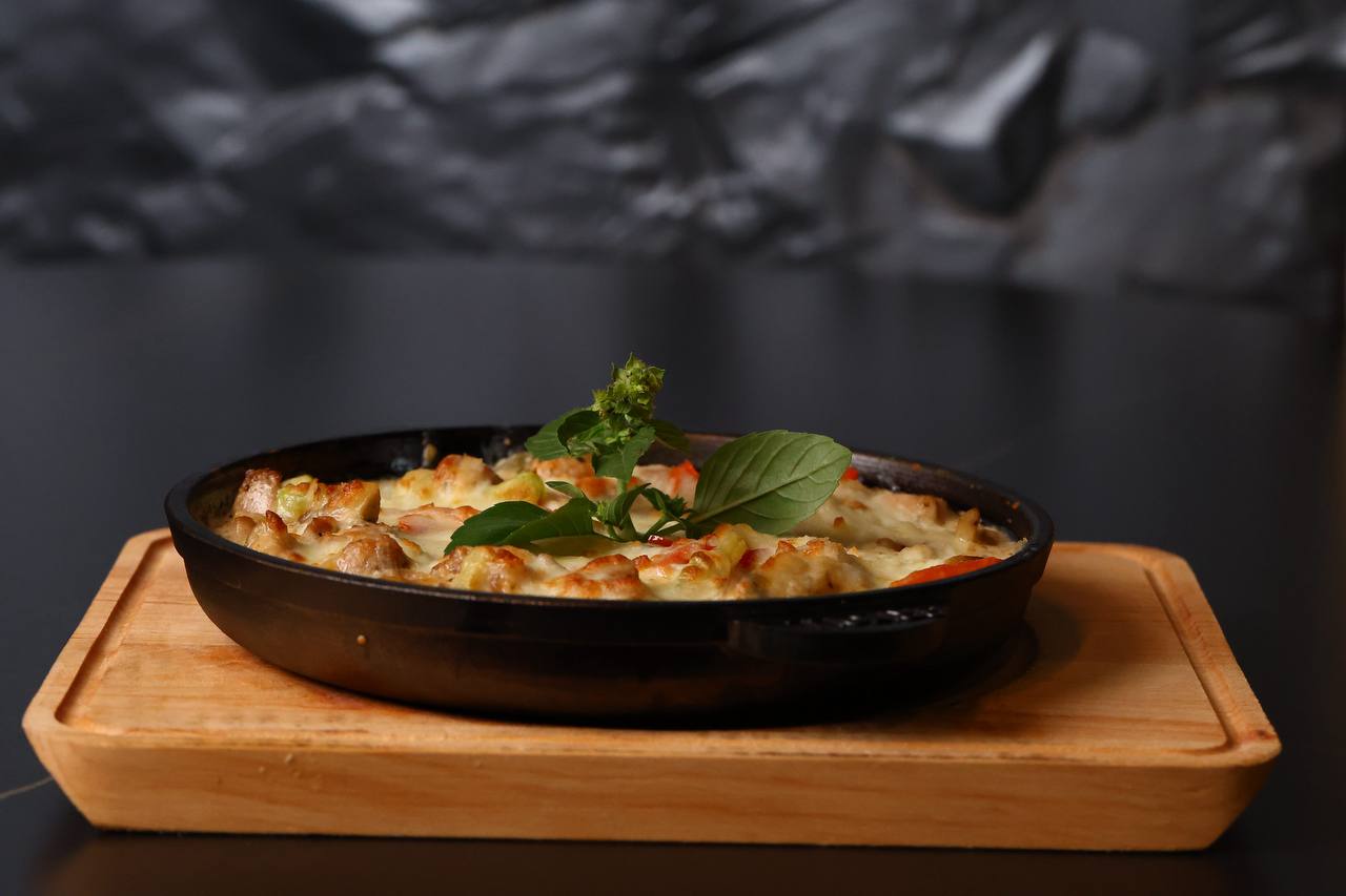 Склад: куряче філе, цибуля ріпчаста, печериці, кабачок, перець болгарський, соус песто, вершки