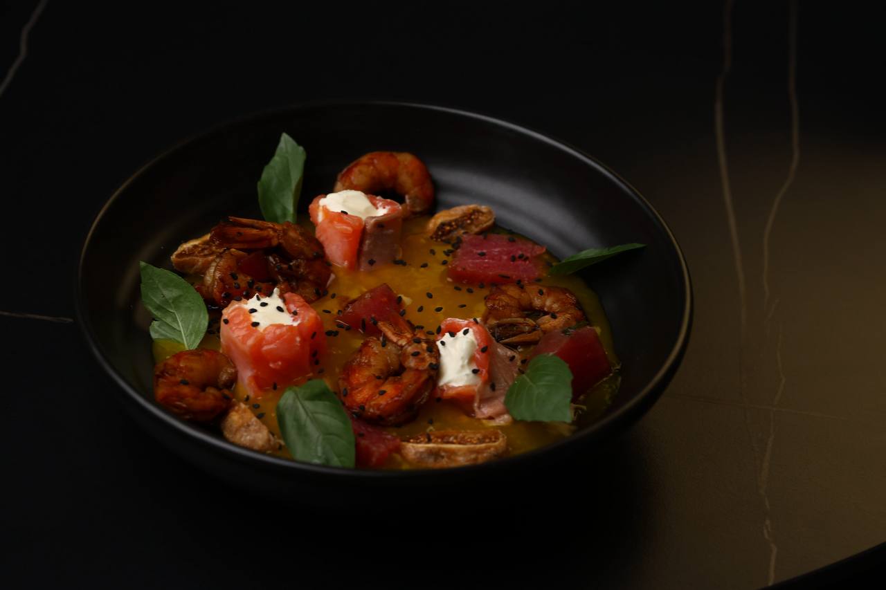 Склад: тунець маринований, хамон, груша, томати чері, авокадо, крем-сир, соус з руколи, соус медово-гірчичнийЗакускиТріо Брускет під вино