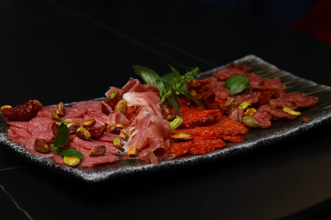 Склад: телятина вирізка, соус річчі, пармезан, мікс салатуЗакускиВітелло тонато з пармезаном та обпаленими черрі